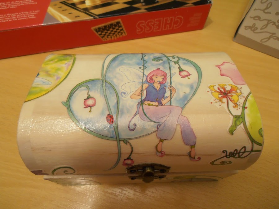 En esta ocasión os dejo una cajita de tesoritos, como yo la llamo, aunque también podría ser un pequeño joyero. Sencilla pero colorida, en unos tonos que me gustan mucho. La caja está forrada en fieltro color vainilla y decorada en tonos granates. Lazos de brillante raso y una imagen Vintage. Tiene poca altura y va personalizada con el nombre. Igualmente su interior va forrada en fieltro vain ...