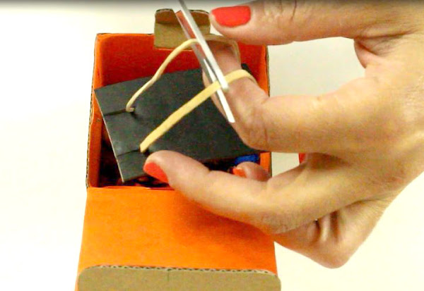 * Haz dos cortes de 1 cm de largo en dos lados del cartón (dos de cada lado). Coloca por ahí las bandas elásticas.