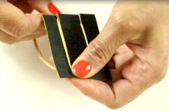 * Toma el cartoncito, corta por la mitad las banditas y pasa los dos trocitos por los agujeritos, de cada lado.