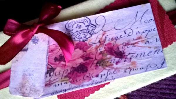 Imagen con tonos granate y una etiqueta con lazo a juego.