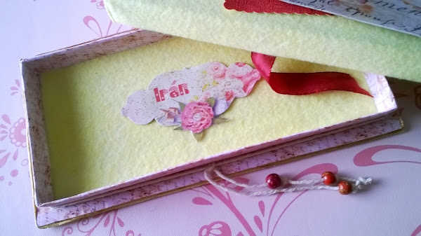 La caja está forrada en fieltro color vainilla y decorada en tonos granates. Lazos de brillante raso y una imagen Vintage.