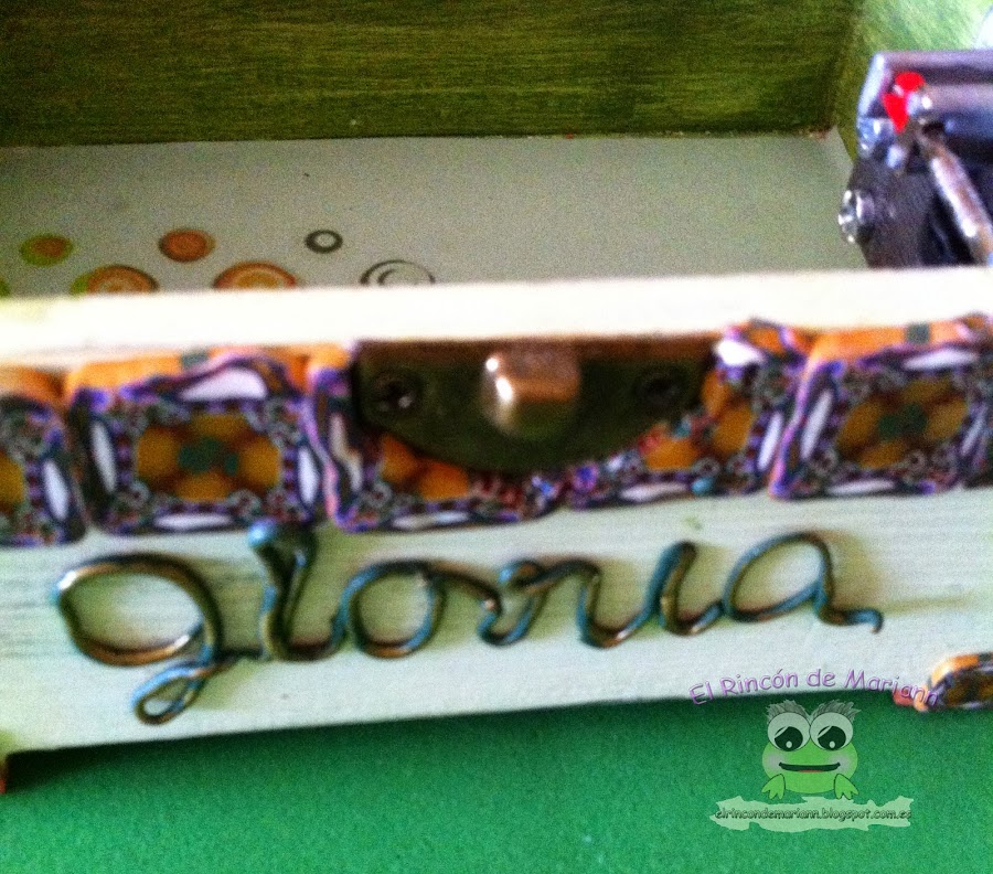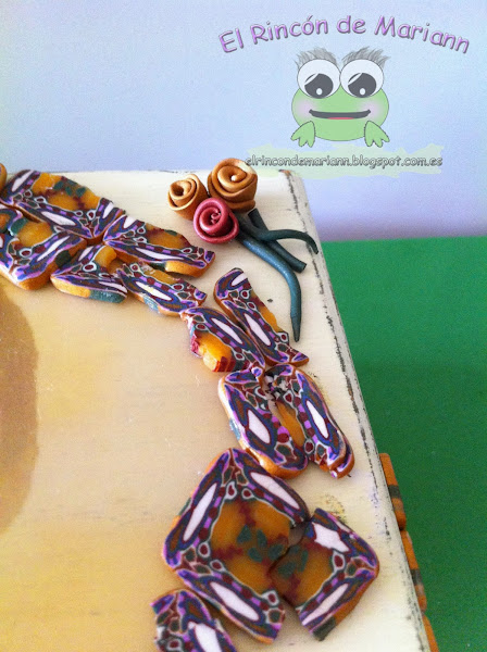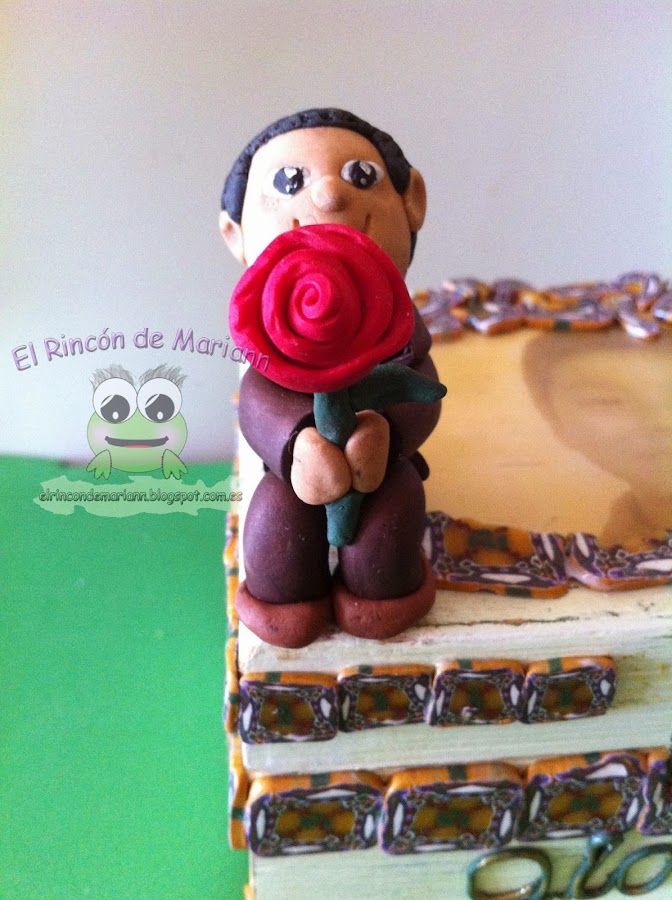 Es una de "mis" cajitas con sentimiento. Pintada, envejecida y decorada con fimo. Las piezas de mosaico o teselas está hechas a mano con la técnica de murrinas, en este caso es una murrina caleidoscopio, la figurita es el hijo ofreciéndole una rosa a su madre y, sobre la tapa una transferencia en fimo líquido de la foto de él.