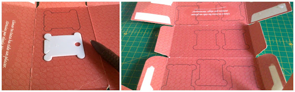 Así que le quité a una de las bobinas el hilo, y sobre una caja de té abierta marqué el dibujo...
