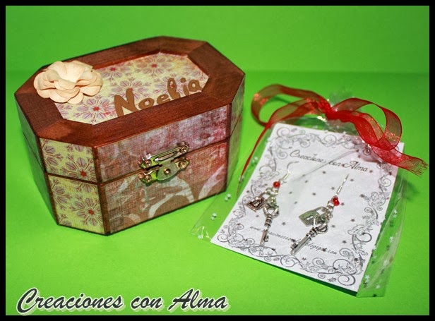 No hace mucho realice un sorteo a través del facebook de Creaciones con Alma por llegar a los 100 me gusta, la ganadora se llevo esta fantástica cajita y los pendientes que ella eligió.