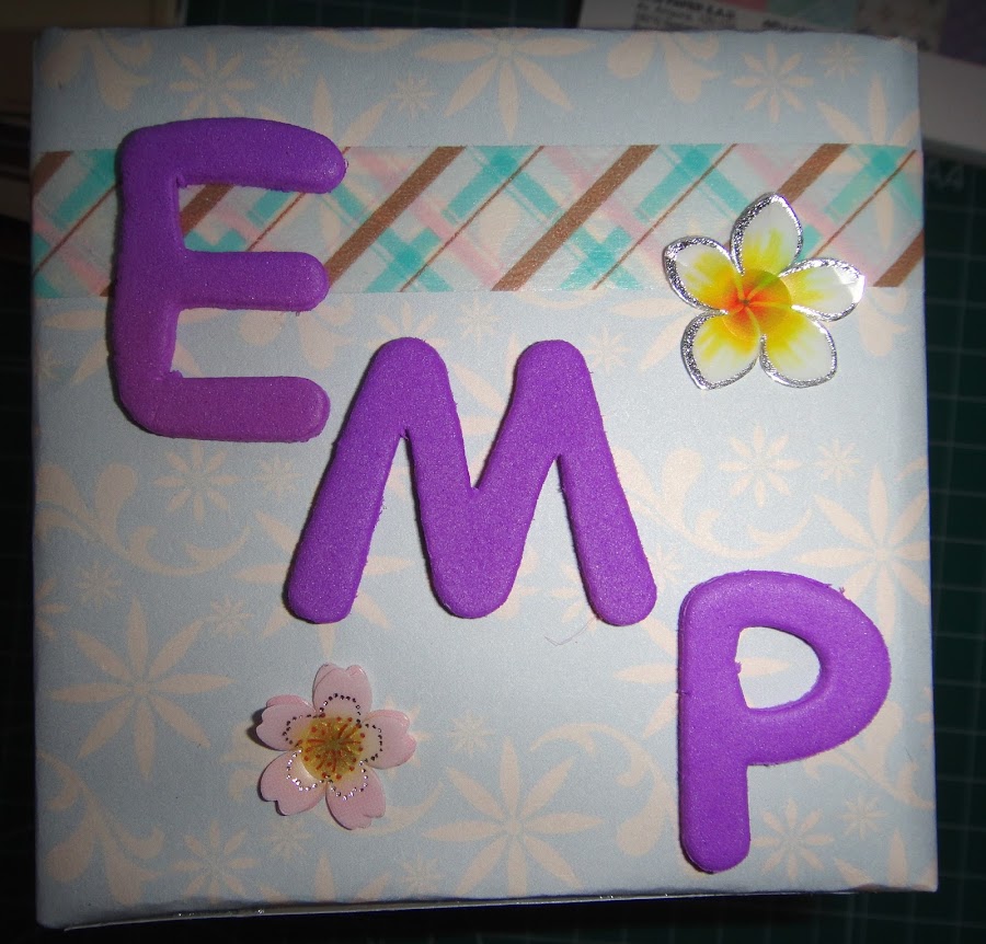 A partir de ahí decidí tratar cada lado por separado, como si fuesen cuadros independientes. Así, cuando me canse, puedo girar la caja y cambiar la imagen. En un lateral puse mis iniciales con goma eva.