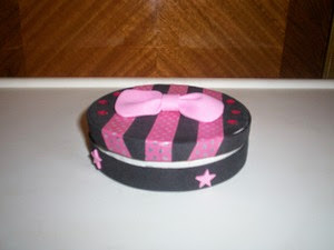 Pues hoy os traigo una de reciclaje y como veis se trata de reciclar una cajita de quesitos. Utilicé goma eva, cinta y lentejuelas que como no tenia de color rosa las pinté con esmalte de uñas jaja