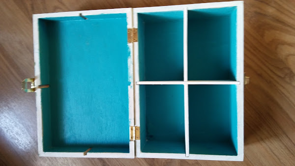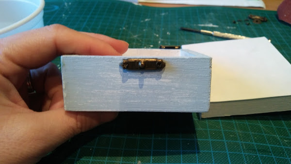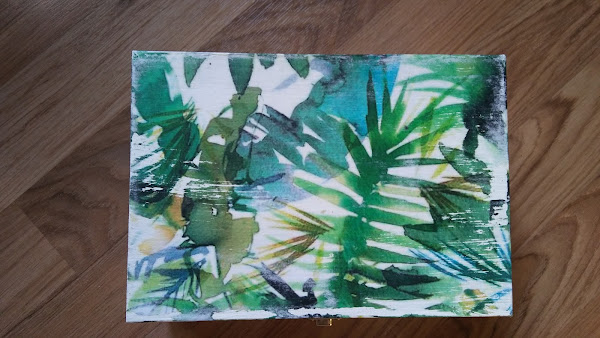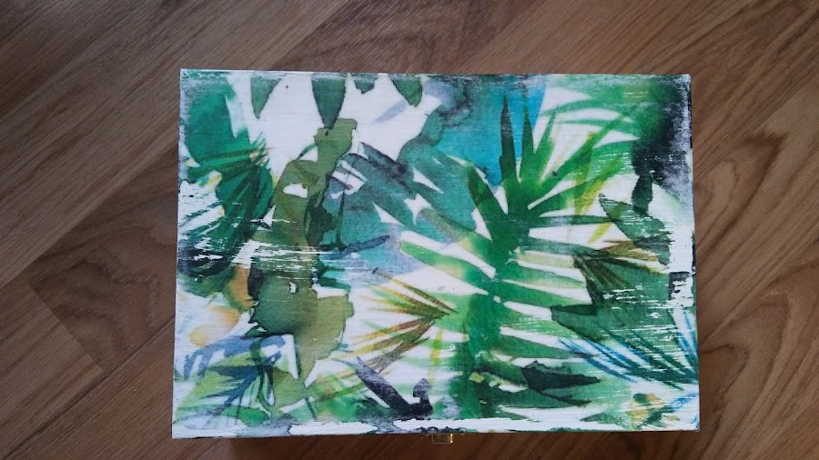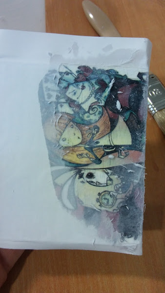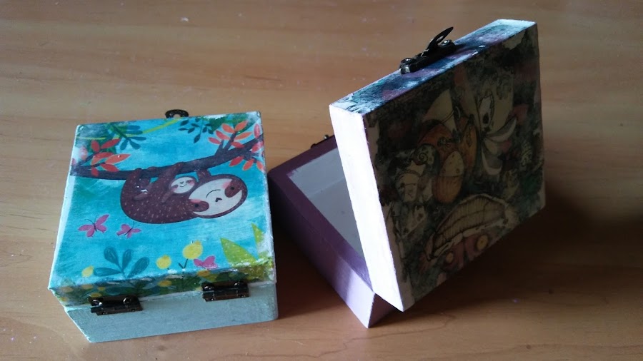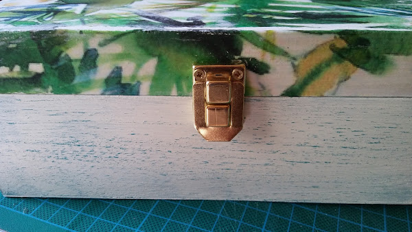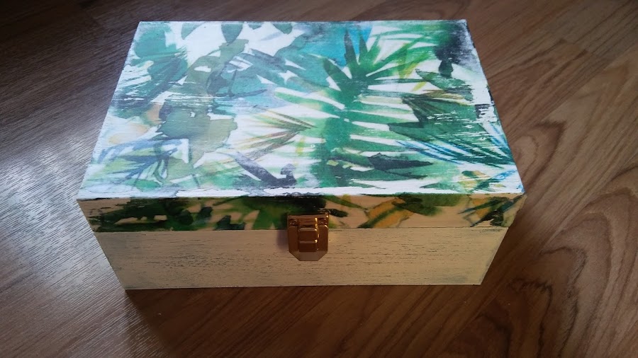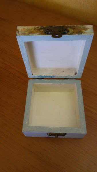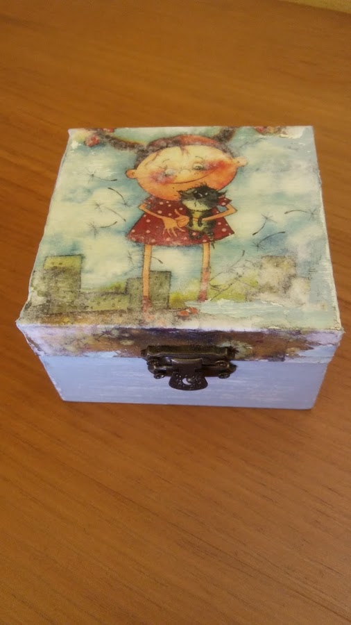 así queda una vez se saca la capa superior del papel, queda la imagen transferida a la caja, se me despellejó un poquito pero como el fondo del papel es blanco y la caja también no quedó mal, además así parecía hecho adrede en plan viejuno, jiji!! le di una capa de barniz, que queda más bonito y protege el papel y luego ya fue ir cuestión de ir montando la caja con sus visagras y cierre frontal para así luego poder llenarla de cositas molonas!!