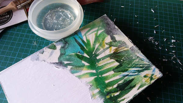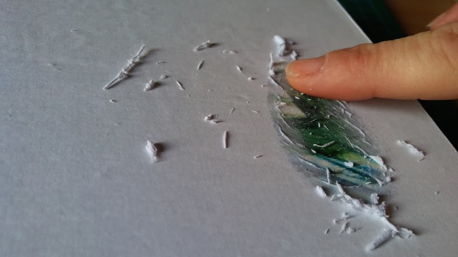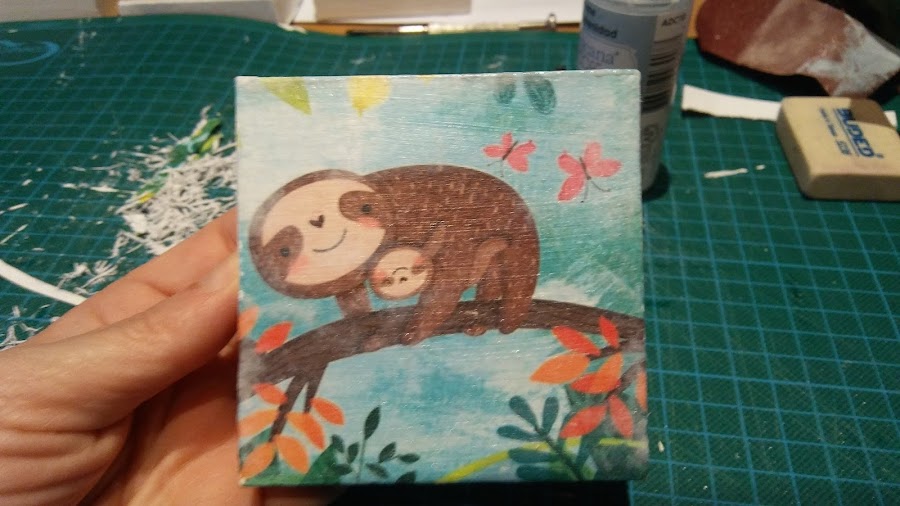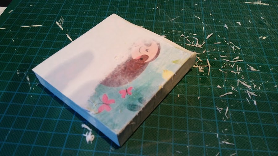 Y aquí os dejo el paso a paso que hice en casa: mojamos el dedico con un poquito de agua y poco a poco haciendo circulitos vamos sacando el papel, esto lo hice al día siguiente de haber hecho el taller, pues el papel debe quedar bien pegado y necesita un tiempo, para que al pasarle el agua se quede pegado la imagen en la caja, hay que ir despacito y con paciencia, pues podríamos romper el dibujo, yo recomiendo hacerlo por la tarde noche y al día siguiente pasarle el agüita