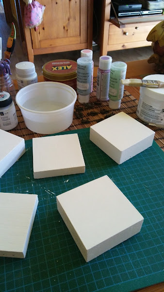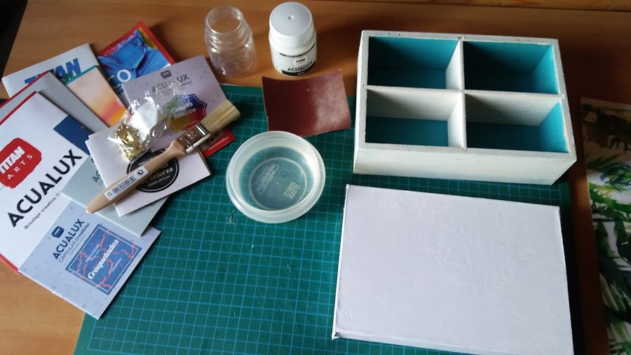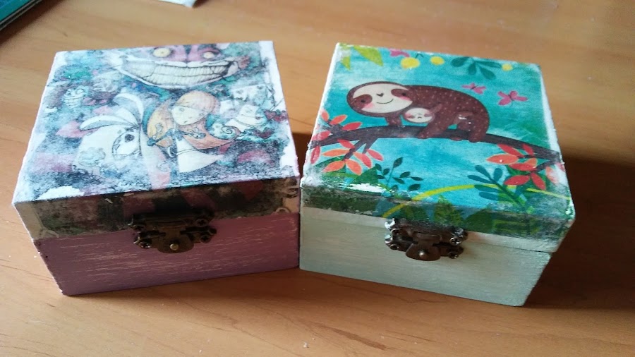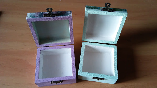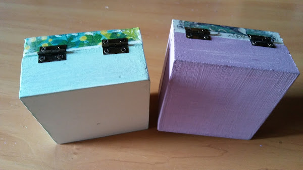 las he pintado de fondo blanco y las bases de la caja en colores verde, azul y lila pastel,