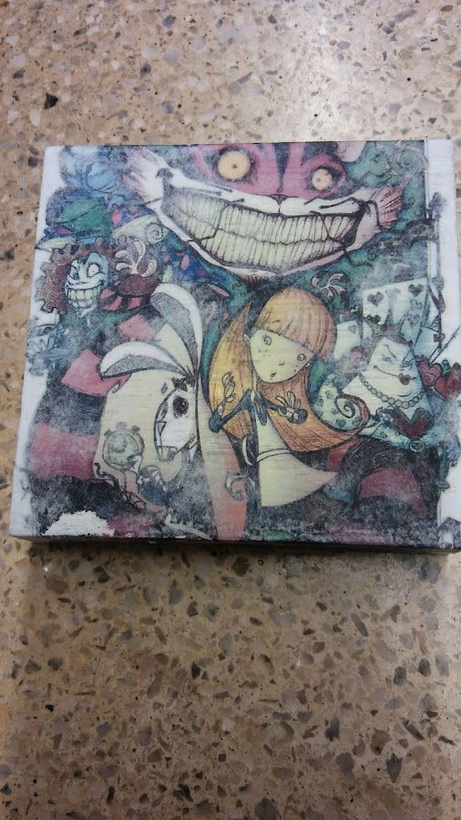 transferir las imágenes con el fototransfer y dejar secar toda la noche y con el dedico mojado en agua circulitos o con una goma de borrar también se puede hacer y luego barnizar para proteger