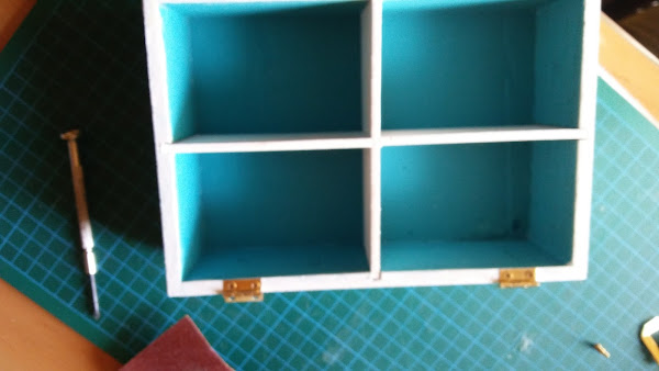 primero lijamos la madera para abrir los poros, una vez abiertos la pintamos del color que queremos que nos quede de base para que nos quede tipo vintage, yo la pinté toda azul por fuera y por dentro; luego una vez seca la pinté de color blanco por fuera y los separadores de dentro, para que al pasar la lija, saliese el color azul, para que quedase en plan desgastado viejuno. una vez está todo bien pintadito y seco ponemos cola (fototransfer) en la parte superior y en los laterales de la tapa y lo aplanamos bien con un rodillo, mano o regla haciendo presión para que quede todo bien lisito y pegadito y así cuando se seque poder empezar a hacer la transferencia.