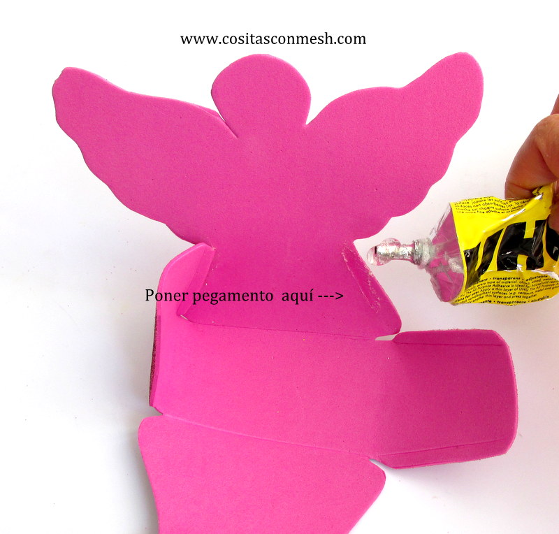 Ahora ponemos un poco de pegamento a cada lado de la parte baja del angelito.