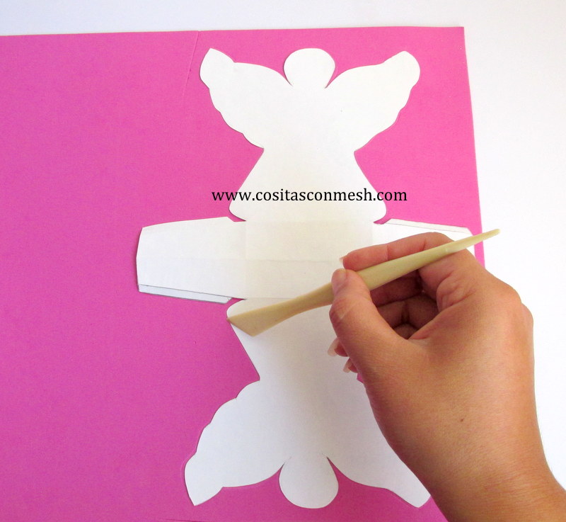 Luego de cortar el molde del angelito, lo transferimos sobre el foami que elegimos para hacer la cajita. En este caso use una esteca para marcar todo el molde sobre el foami, si no tienes esteca puedes usar un lápiz o un palito de brocheta.