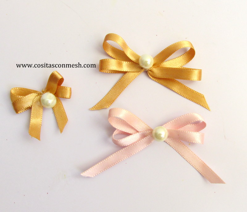Ya que tenemos los moñitos de listón, pegamos una perlita blanca justo donde hicimos ese amarre con el hilo.