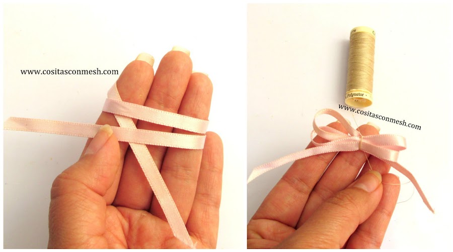 Para hacer el moñito, uso 3 de mis dedos, luego con el listón doy 2 o 3 vueltas, luego con hilo lo amarro por el centro, y eso es todo.