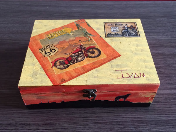 Mi ultimo trabajo de febrero fue esta caja, para otro cumpleaños. Esta vez, para una amiga que cumple 90 años pero que sigue siendo joven de espíritu. Me pidieron una caja con colores y vistosa y que llevara el nombre de la cumpleañera en grande. Use dos servilletas y el resultado es este
