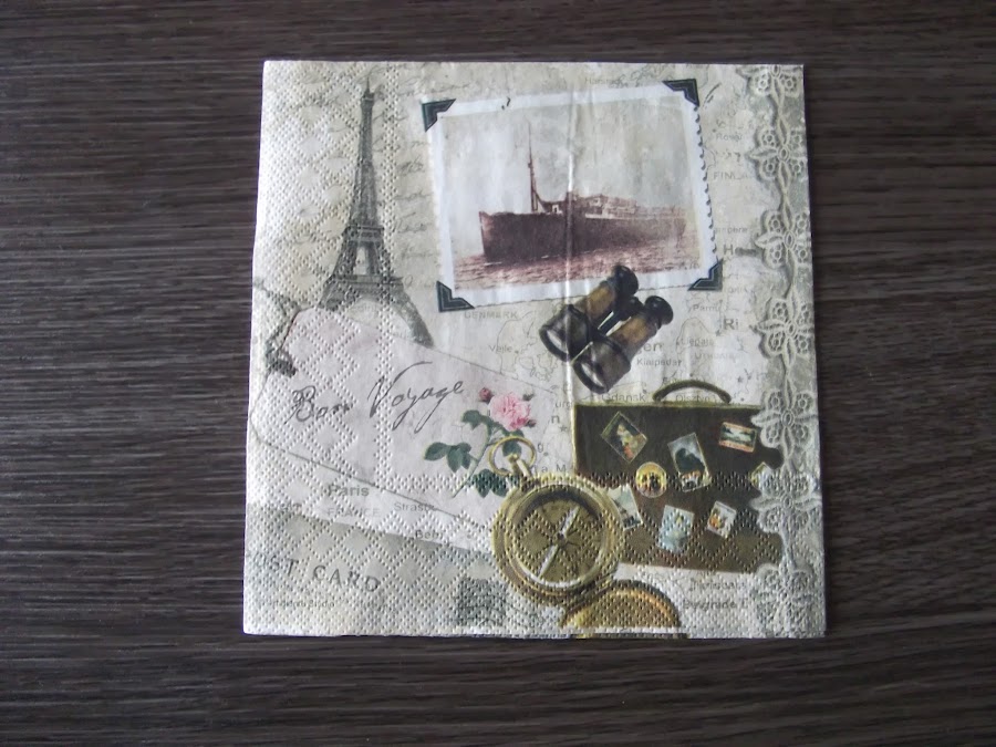 Esta caja me la pidieron para hacer un regalo a una hija, supuestamente se habrá convertido en un costurero. Me pidieron esta servilleta como temática y como me dejaron via libre para la base de la caja, la convertí en una maleta con detalles de paris y este ha sido el resultado