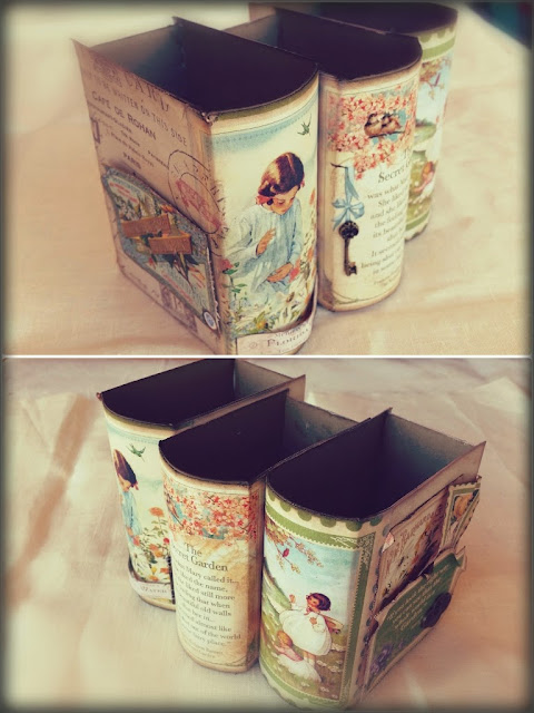 El segundo lo vi en pinterest y segui el tutorial para hacer estos falsos libros que se convierten en cajitas verticales para guardar lápices, pequeñas herramientas, tarjetas, notas...