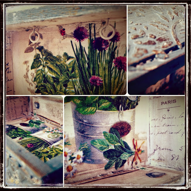 Découpage para decorar el espacio interior y le añadí unas hembrillas pintadas en blanco, para utilizarlo como colgador de pendientes.