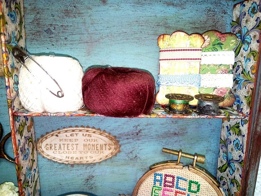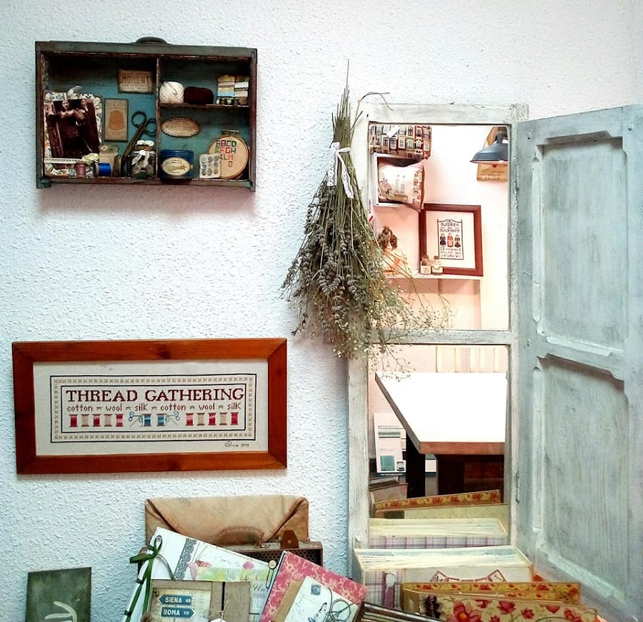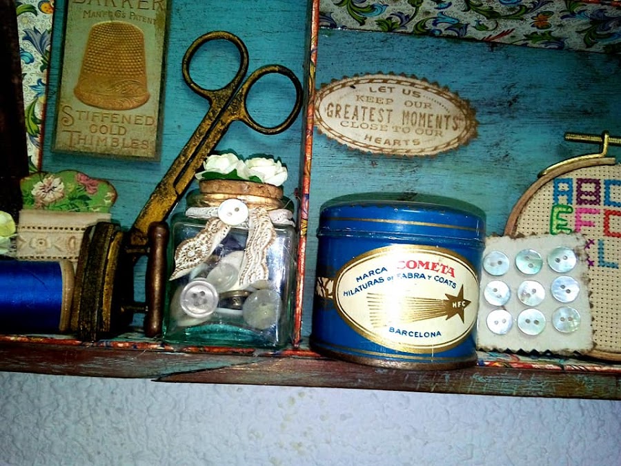 En mi caso, costura, con recuerdos de familia y como homenaje a mi abuela, que fue modista como muchas mujeres de esa época, a la que podéis ver en la foto. Y no falta tampoco un bordado que Elena empezó siendo muy pequeña, una tijera y canillas que he oxidado, un bote precioso para hilos, carretes de bordar de mi madre....