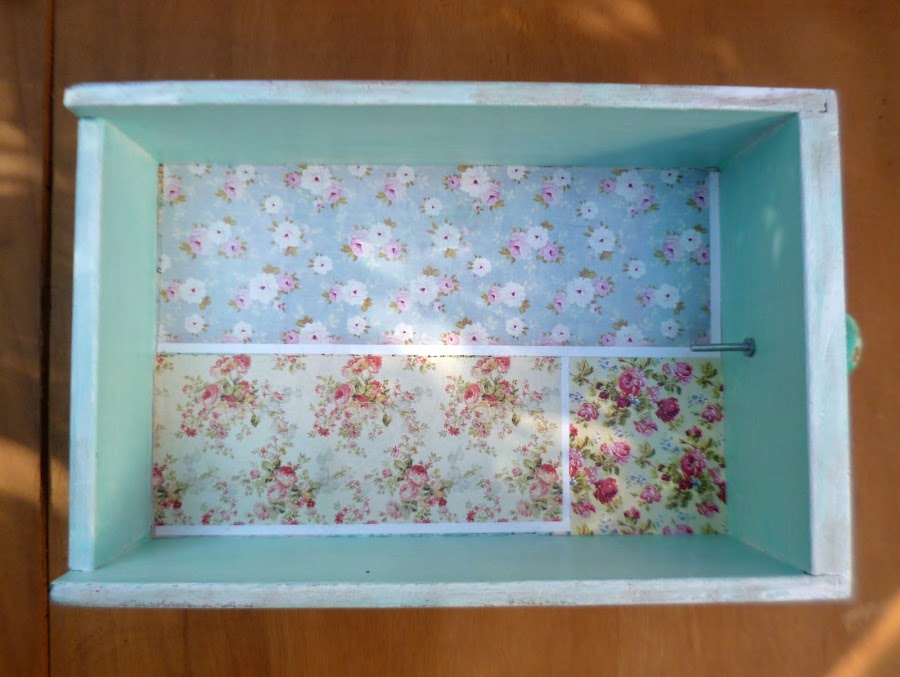 El tirador fue cambiado por otro de madera pintado de verde azulado y el interior recibió un aguada del mismo color.