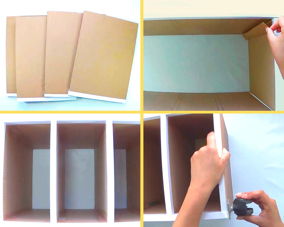 Una vez pegados los divisores, mide la parte posterior de la cajonera y corta la pieza en cartón, forra la parte exterior y pégala en su lugar con cola blanca.