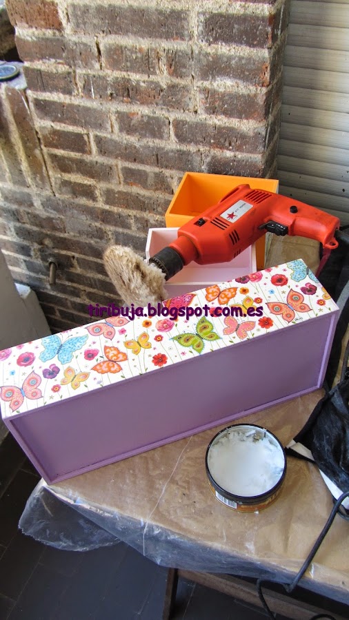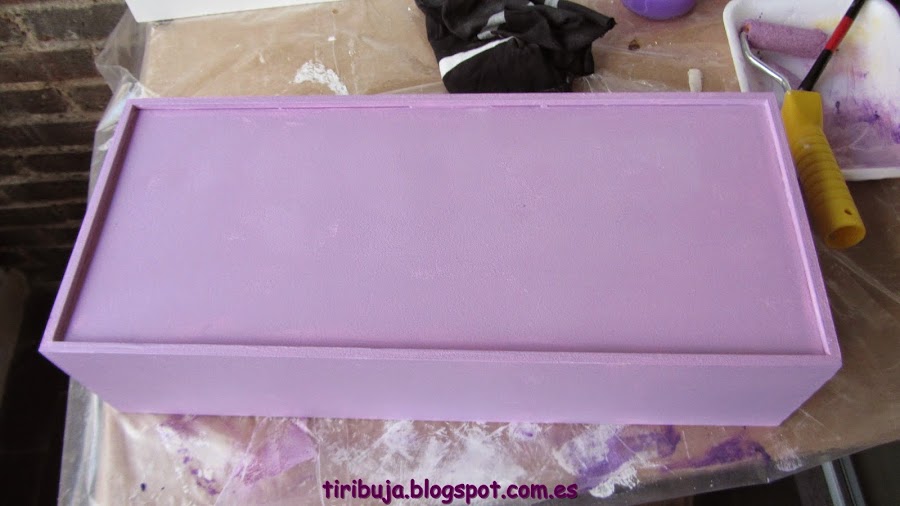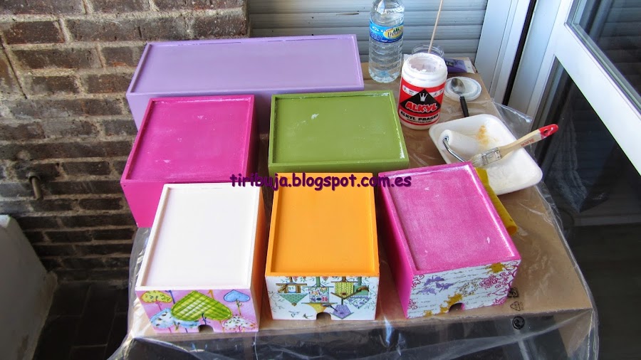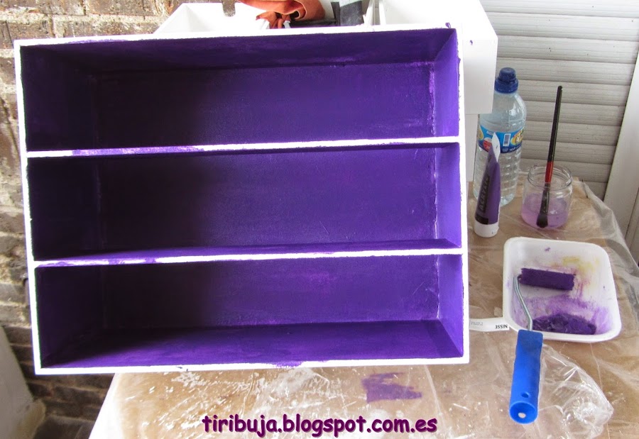 El armazón lo pinto de morado y los cajones de diferentes colores, lila, rosa fucsia, rosa claro, verde y naranja.
