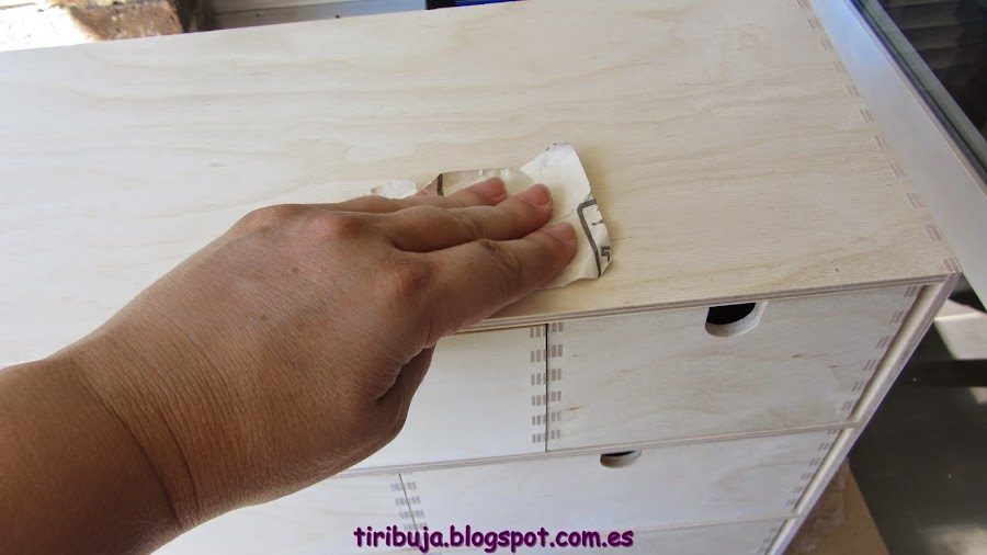 Una capa de alkil y dos capas de barniz al agua en todo, dejando secar entre capa y capa, aquí secando los cajones.