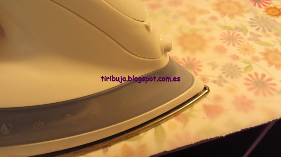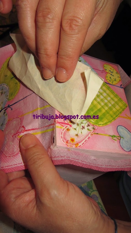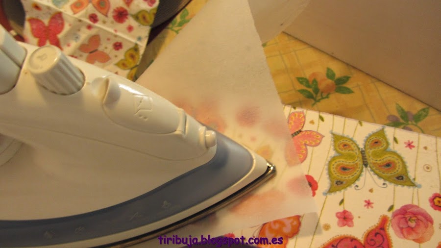 La colocación de las servilletas es de la siguiente manera: dar una mano de alkil aguado sobre la superficie, dejo secar un poco, lo justo para que se pueda manejar bien la servilleta sin que se quede pegada, coloco la servilleta, encima papel de horno y lo planchamos sin vapor hasta que esté bien pegada.