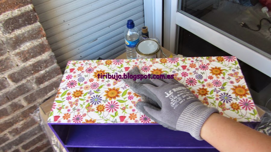 Primero el armazón de la cajonera.... una servilleta de flores que combina muy bien con la pintura morada.