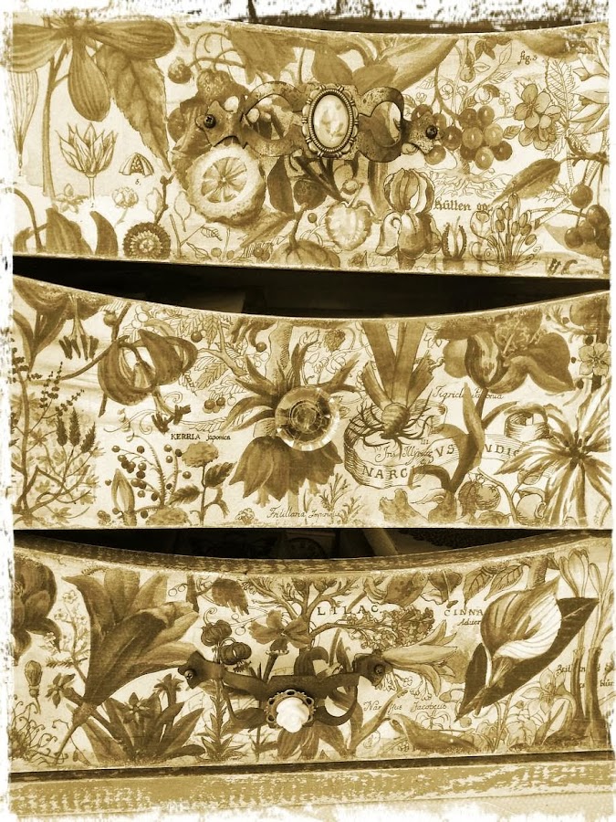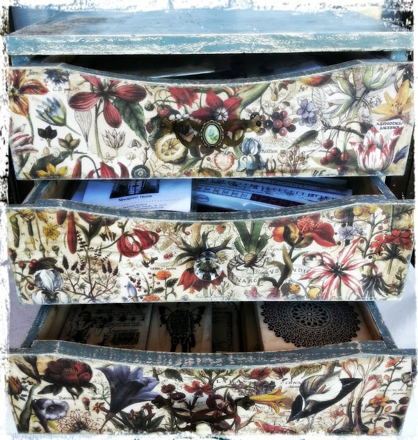Bueno, pues después de este desahogo, deciros que en ese trance entre ocio y trabajo, con el bajón de ánimo que suponía, y con ganas de no pensar mucho lo que se me venía encima, pillé por banda una cajonera de madera que tenía medio abandonada en una estantería, y que por su tamaño gigante quizá, por la falta de tiempo, por la desgana o por la falta de inspiración, cualquiera de estos motivos me vale, no me había puesto a decorarla hasta ese día.