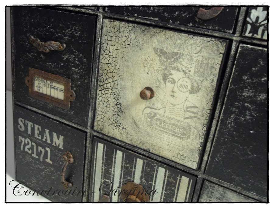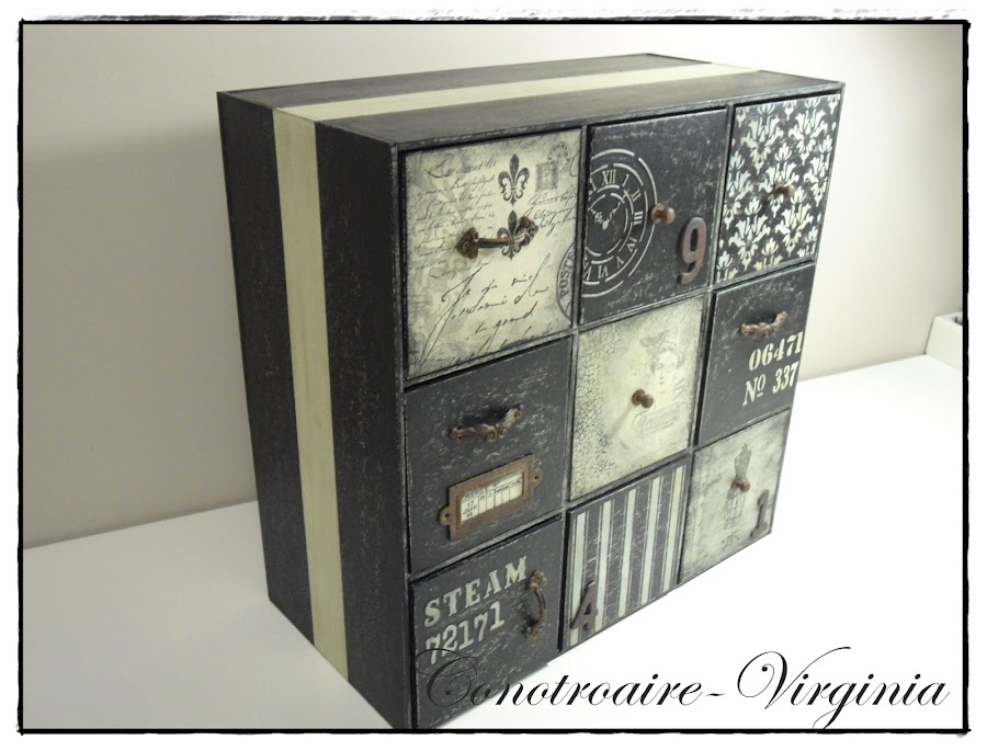 De nuevo por aquí para mostraros mi ultimo trabajo..............esta cajonera de estilo muy vintage, construida completamente con cartón gris de 3mm.