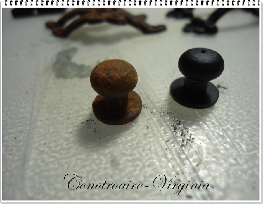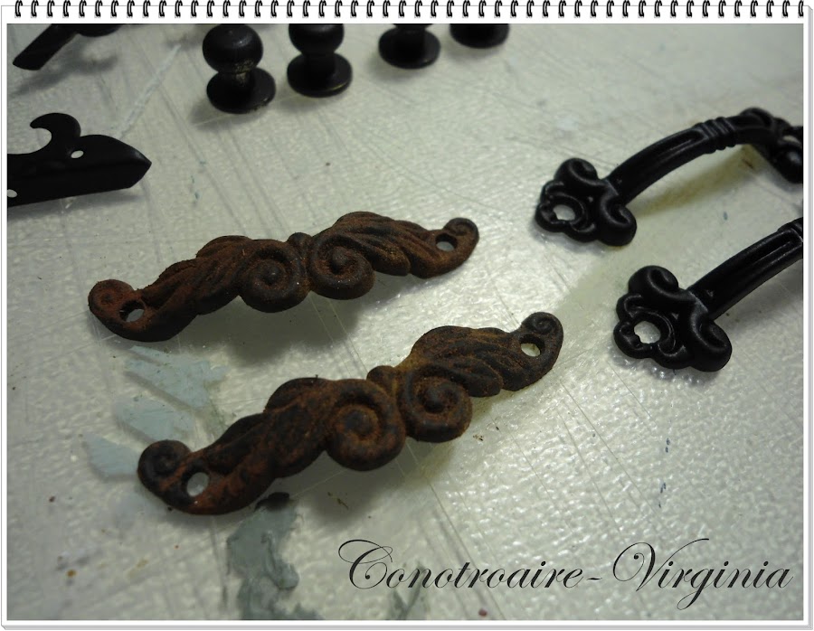 Para los tiradores, lo que voy guardando que me sobra de otros trabajos. Para unificarlo primero todo lo pinte con pintura en spray negro mate, y luego la imitación a oxido. Los números 9,4 y 1 son pequeñas siluetas de madera a las que aplique la misma técnica.