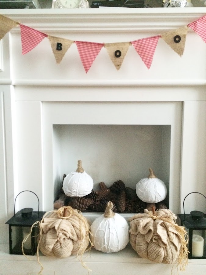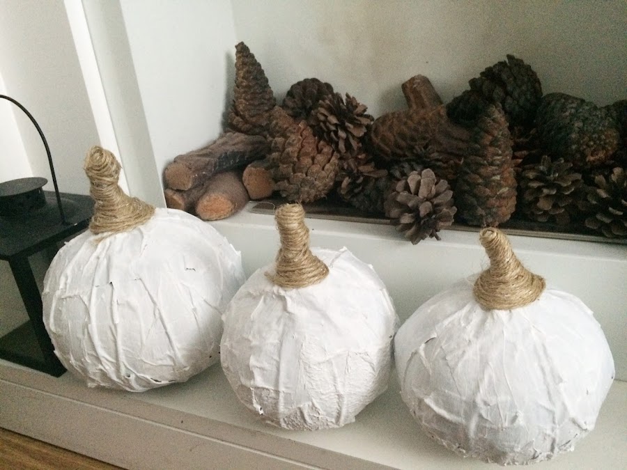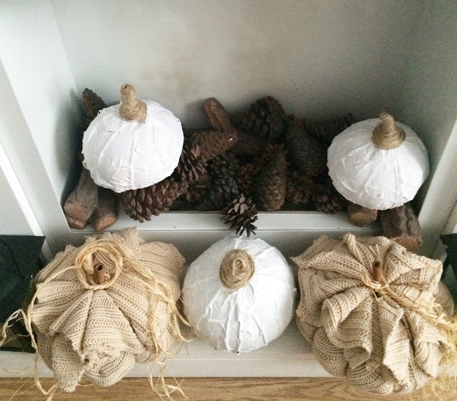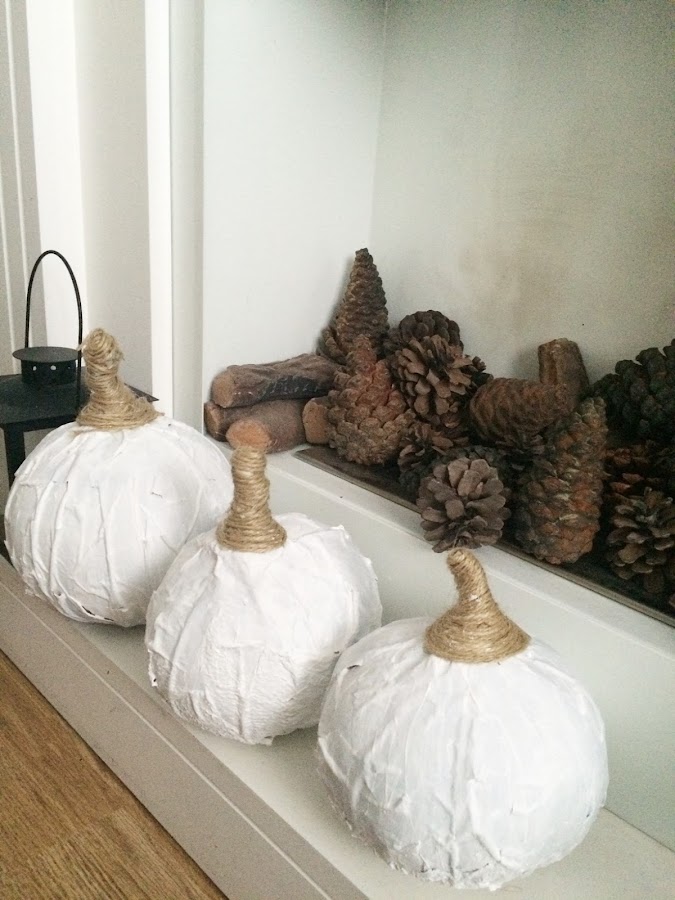 Parece que vivo obsesionada con ellas, je je, pero envidio esos campos llenos de calabazas donde uno va a elegir y comprar la suya y si ya es un campo lleno de calabazas más blanquitas, mi adoración es total. Como aquí no es fácil encontrar calabazas (más que en el súper, y gracias) y menos aún blancas, se me ocurrió hacer unas que fueran bien con la deco de mi chimenea y con las sweater pumpkins que publiqué aquí el lunes (podéis ver el DIY completo aquí).