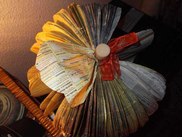 Necesitamos una guía de teléfonos, que si haces como yo tendrás alguna guardada que ya no sirva, claro que también podemos hacerlo con un libro...pero me niego, una revista en desuso de estas gordas también nos sirve, un corcho de una botella de vino y un trozo de lazo naranja, verde o de los dos colores.