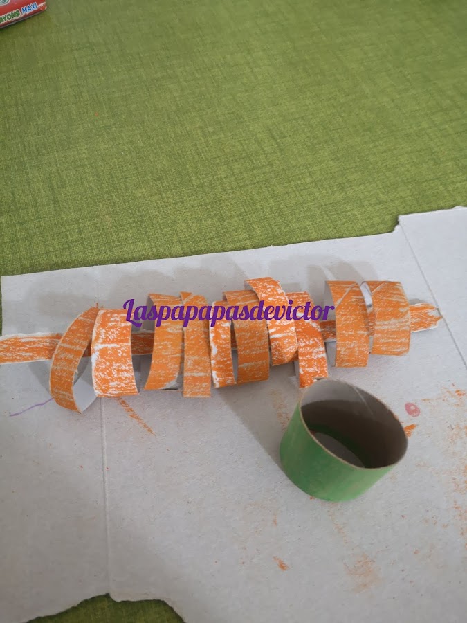 Y los tres tubos que serán la hortaliza em naranja cada tubo lo partimos em 4 trozos y un trozo a lo largo, que será lo que sujete los demas tubos