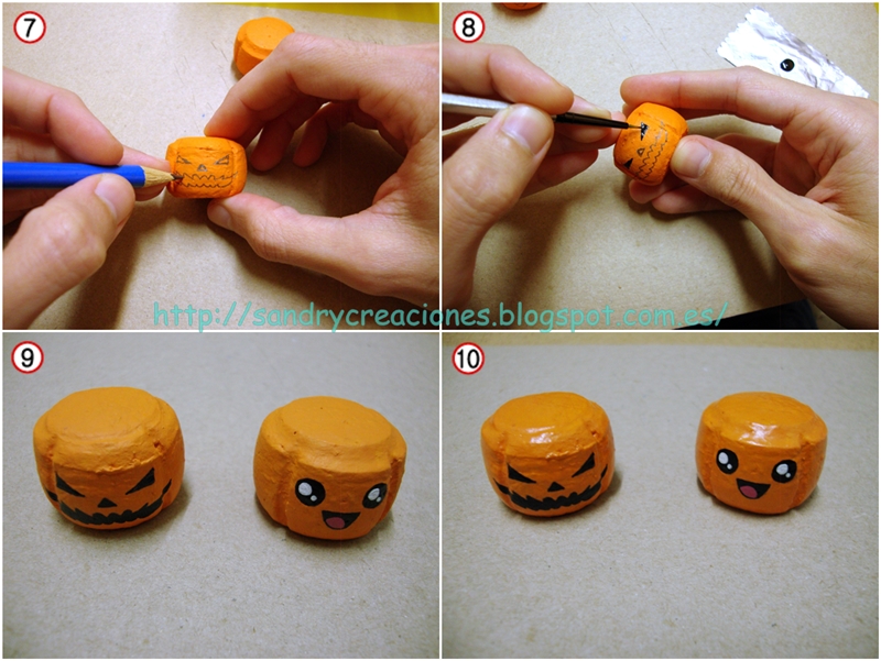 Una vez seca la pintura procederemos a dibujar la cara de la calabaza con un pincel fino y pintura acrílica de color negro. Antes de aplicar la pintura podemos dibujar la cara con un lápiz primero (imagen nº 7) y luego usar el dibujo de referencia al aplicar la pintura negra (imagen nº 8). Nosotros decidimos hacer una cara terrorífica en la calabaza adorna lápices y una cara tierna o Kawaii para la calabaza llavero. En la cara Kawaii utilizamos pintura acrílica blanca y rosa oscuro para hacer los brillos de los ojos y los detalles de la boca (imagen nº 9). Una vez terminado y con todo perfectamente seco podemos darle una capa de barniz a las calabazas para proteger la pintura y darle un mejor acabado ya sea con barniz mate, brillante o satinado, a gusto de cada uno (imagen nº 10).