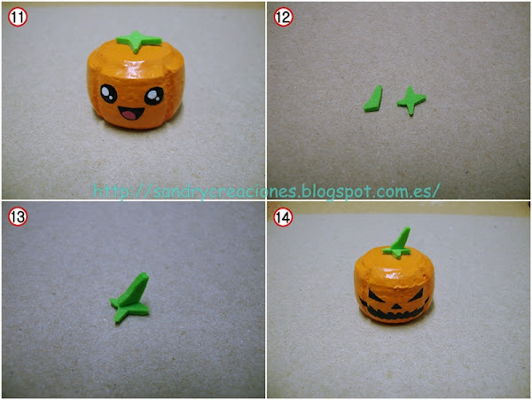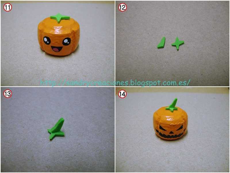 Para finalizar, realizaremos el tallo de las calabazas en goma EVA de color verde, para realizar el tallo haremos una estrella de cuatro puntas con Goma EVA, sin necesidad de que sea muy simétrica y con un tamaño que no sea muy grande, aunque todo depende del gusto de cada uno ;). En la calabaza llavero pegaremos la estrella en el centro con cola de cianoacrilato en Gel Ceys (Foto nº11), en la calabaza adorna lápices antes de pegar la estrella de Goma EVA pegaremos con cola de cianoacrilato en Gel Ceys un trozo de Goma EVA pegada en vertical simulando el tallo (Foto nº12 y 13) y una vez seca, pegaremos esta estructura resultante en la parte central superior de la calabaza adorna lápices (Foto nº14).