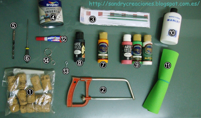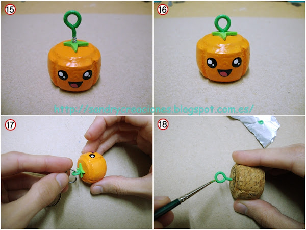 Tras estos pasos la calabaza adorna lápices estaría terminada y ya solo nos faltaría terminar la calabaza llavero, para ello usaremos la hembrilla cerrada. Enroscaremos la hembrilla cerrada en la parte superior haciendo un poco de fuerza, atravesando la goma EVA y el corcho hasta que todo el pie de la hembrilla quede dentro del corcho (Fotos nº 15 y 16). Luego a través de esta hembrilla juntaremos toda la estructura del llavero (Foto nº17) y así daremos por terminada la calabaza llavero ;) . Como propuesta opcional nosotros pintamos la hembrilla de color verde para simular el tallo de la calabaza, de esta manera, primero le pusimos un par de capas de imprimación y una vez estuvo seca la pintamos con dos capas de pintura acrílica verde y la barnizamos con el mismo barniz usado en la calabaza (Foto nº 18).
