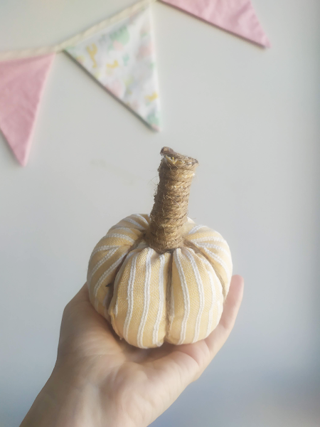 Los materiales que necesitamos para hacer estas calabazas son muy poco y si eres amante del DIY seguro que los tienes todos: Un trozo de tela de 30x30 cm, algo para atar la calabaza, yo he elegido cuerda rústica, relleno de cojín y pistola de silicona.