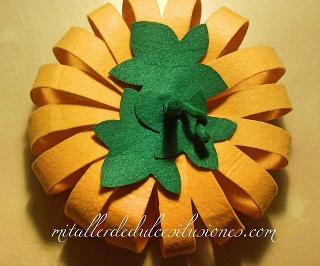 5. Ya sólo queda que hagáis vuestra hoja y un rabo de calabaza,aquí os dejo el molde de la hoja que hice yo,en el material que queráis,más grande o más pequeña. El rabo podéis hacerlo con un alambre para poder darle forma forrado del material elegido,pegáis encima de vuestra calabaza y listo,ya esta hecha!!!!