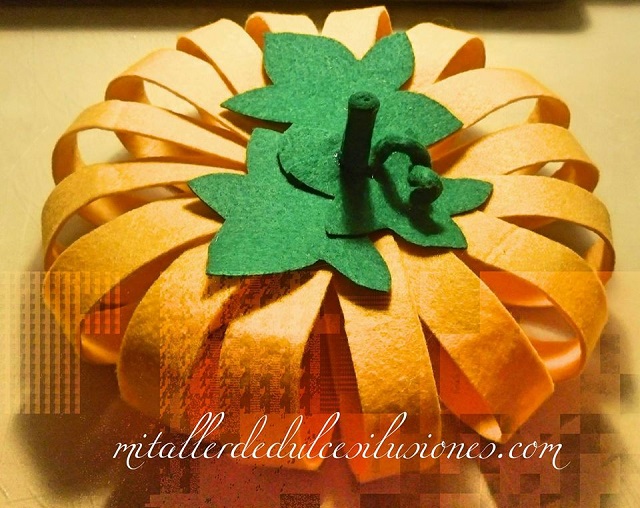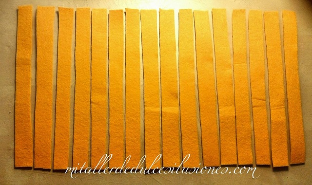 Cortáis tantas tiras como queráis,yo corte en una 16 tiras y en la más grande 20,el ancho de la tira ,también a vuestra elección,las mías miden 1,5cm y el largo igual,cuanto más largas ,más grandes serán las calabazas.