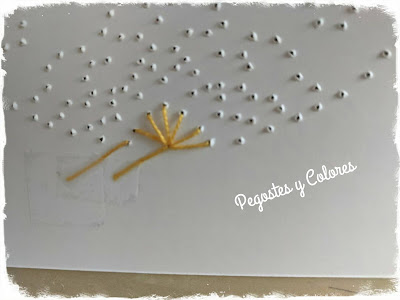 4.- Por el reverso de las perforaciones se ven y se sienten las perforaciones de cada punto con relieve, de ese lado introducimos la aguja con el color que elijas. En mi caso comencé con el amarillo para hacer el centro de la flor de la cima de la calavera.