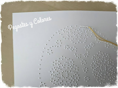 3.- Comenzamos a perforar, puedes usar la misma aguja con la que vas a bordar empujándola con un dedal para proteger tus dedos o un punzón como el que de ve en la foto. Solo asegurate en otro pedazo de carton aparte, que la aguja que vas a usar para bordar pasa por las perforaciones de tu punzón.