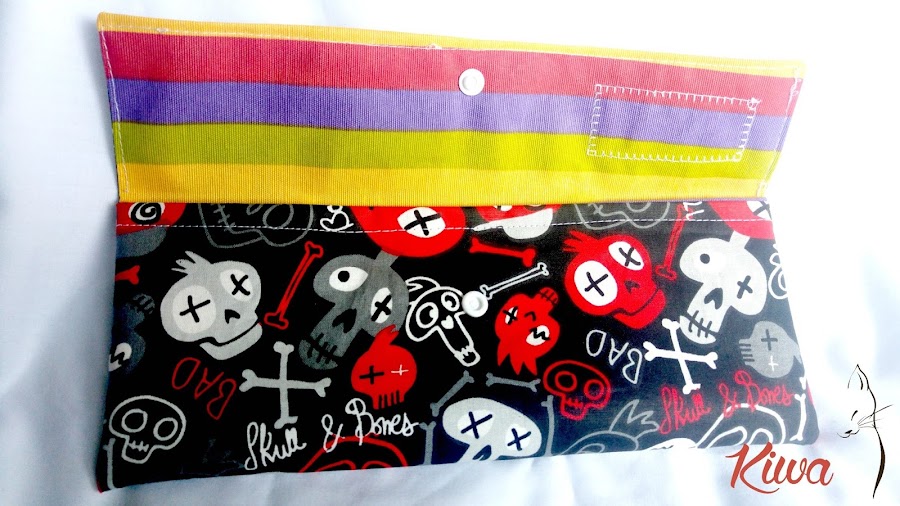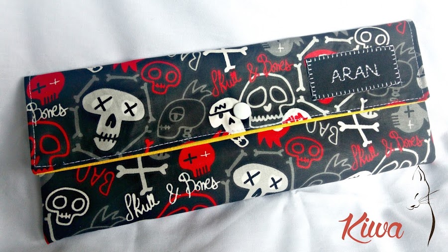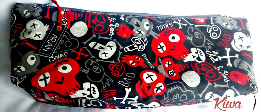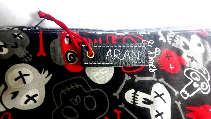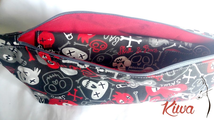 El neceser principal, estuche de cremallera con bastante fondo, con el estampado elegido por él (qué tendrán los huesos que tanto le llaman la atención?), forradito en algodón rojo y reforzado con fieltro en el interior para que tenga cuerpo.