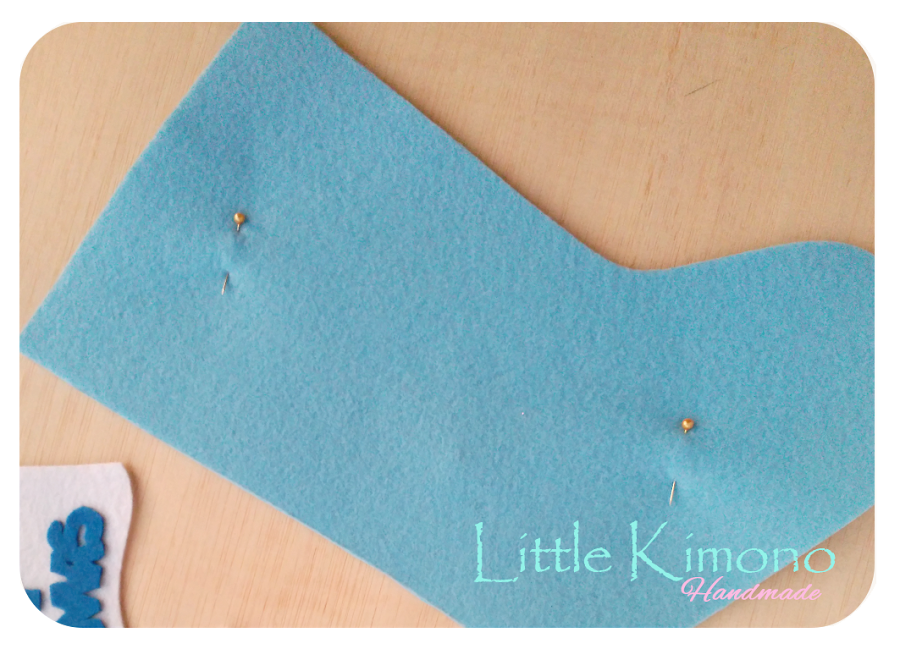 6. Una vez hecho esto ya podemos unir las 2 piezas del calcetín, colocando en un extremo de la parte superior un trozo de cinta o fieltro que usaremos para colgarlo.