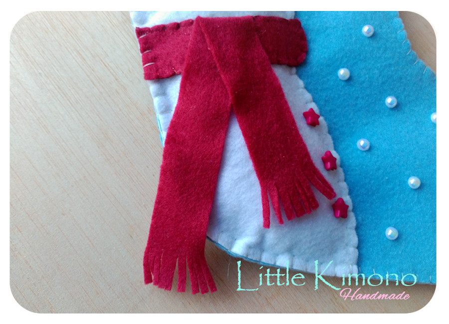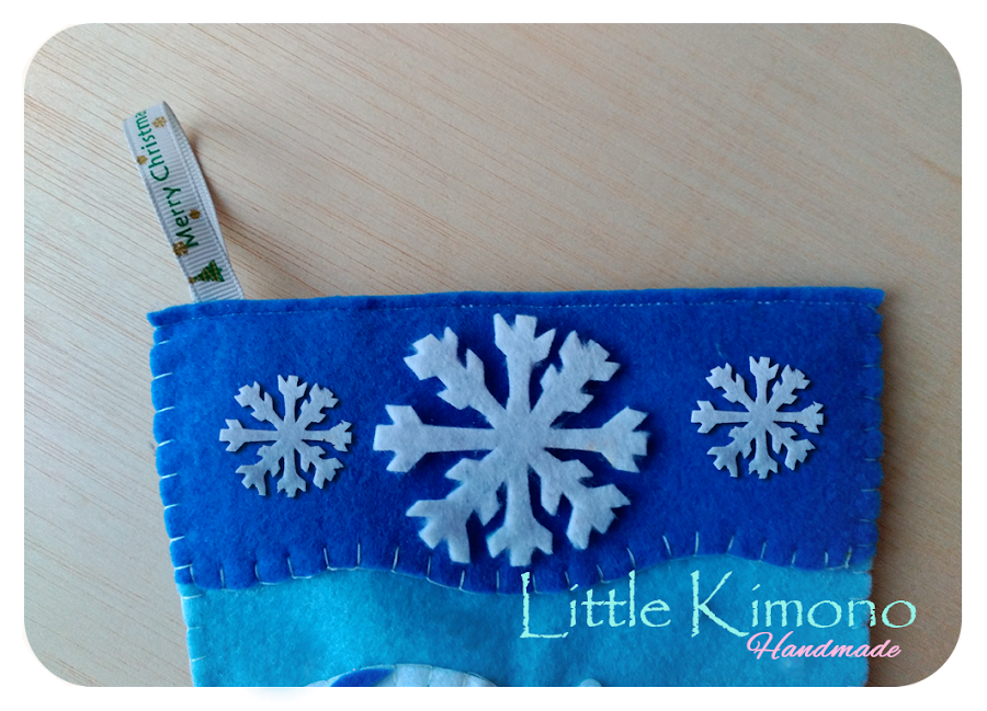 Como véis yo al final decidí poner una pieza azul en la parte superior, así parecerá que el calcetín tiene un doblés y encima coloqué unos copos de nieve.