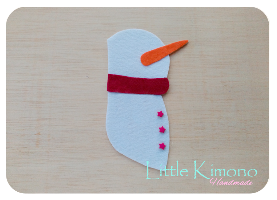 3. Iremos por partes, primero montaremos el muñeco de nieve... Cortaremos la pieza blanca completa y luego montaremos encima la nariz y la bufanda