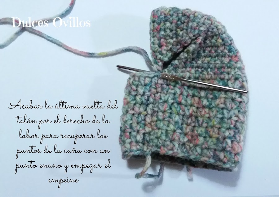 Empeine y planta : Recuperamos con 1 p.e. los m.p.a. de la caña que han quedado sin tejer. 2 cad. para subir y 1 p.m.a. en la base de estas cad., *saltar 1 p., 2 p.m.a. trabajados en el mismo p.* Rep.* hasta el final. Tendremos 10 pares de p.m.a. Recuperar los puntos del talón saltando la cad. del principio. 2 p.m.a. trabajados en el mismo p., saltar 1 p. Trabajar la secuencia hasta el final del talón. Unir con 1 p.e. Tendremos 20 pares de p.m.a.