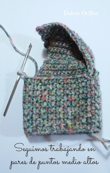 Sig.v. (disminución): 2 cad. para subir y 1 p.m.a. en la base de estas cad., *saltar 1 p., 2 p.m.a. trabajados en el mismo p.* Rep * 6 veces más., 1 p.m.a., 1 p.m.a., volver a trab. en secuencias de *saltar 1 p., 2 p.m.a. trabajados en el mismo p. 8 veces para finalizar con 1 p.m.a., 1 p.m.a. y 1 p.e. en la 2ª cad. de in.
